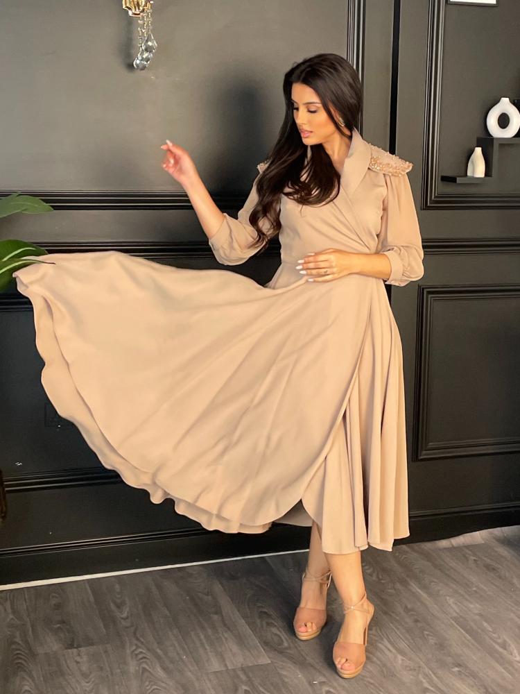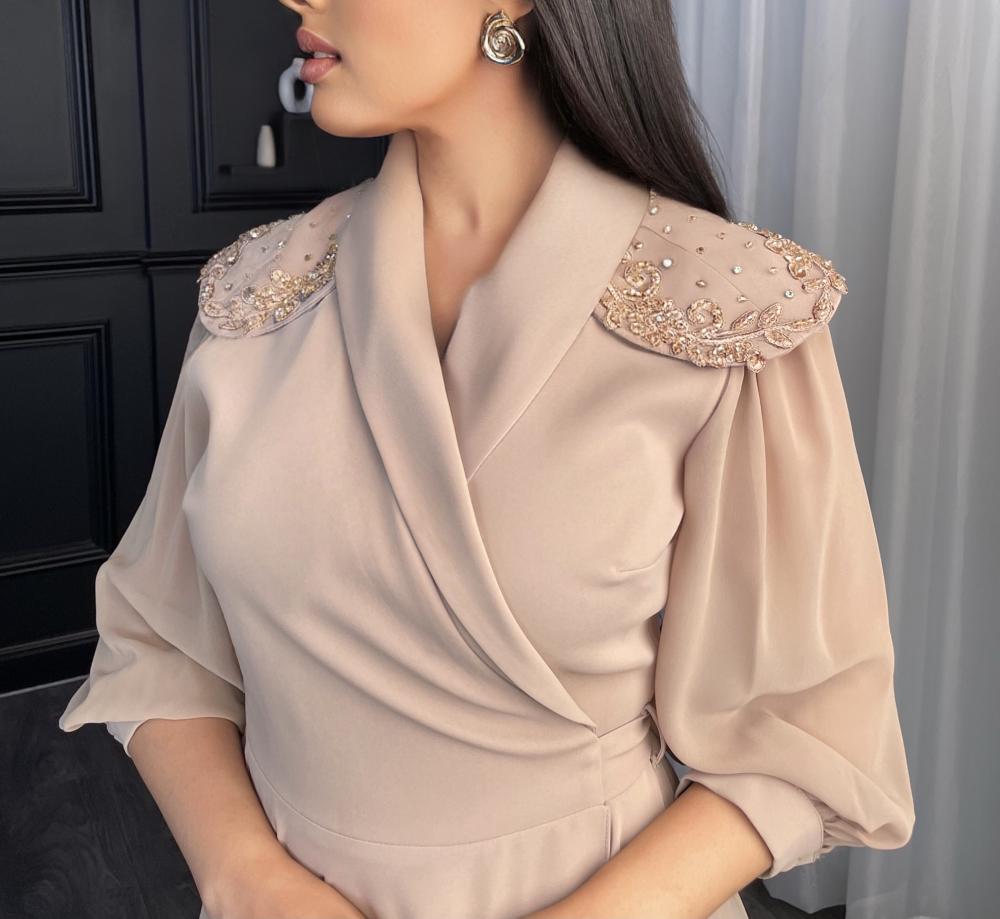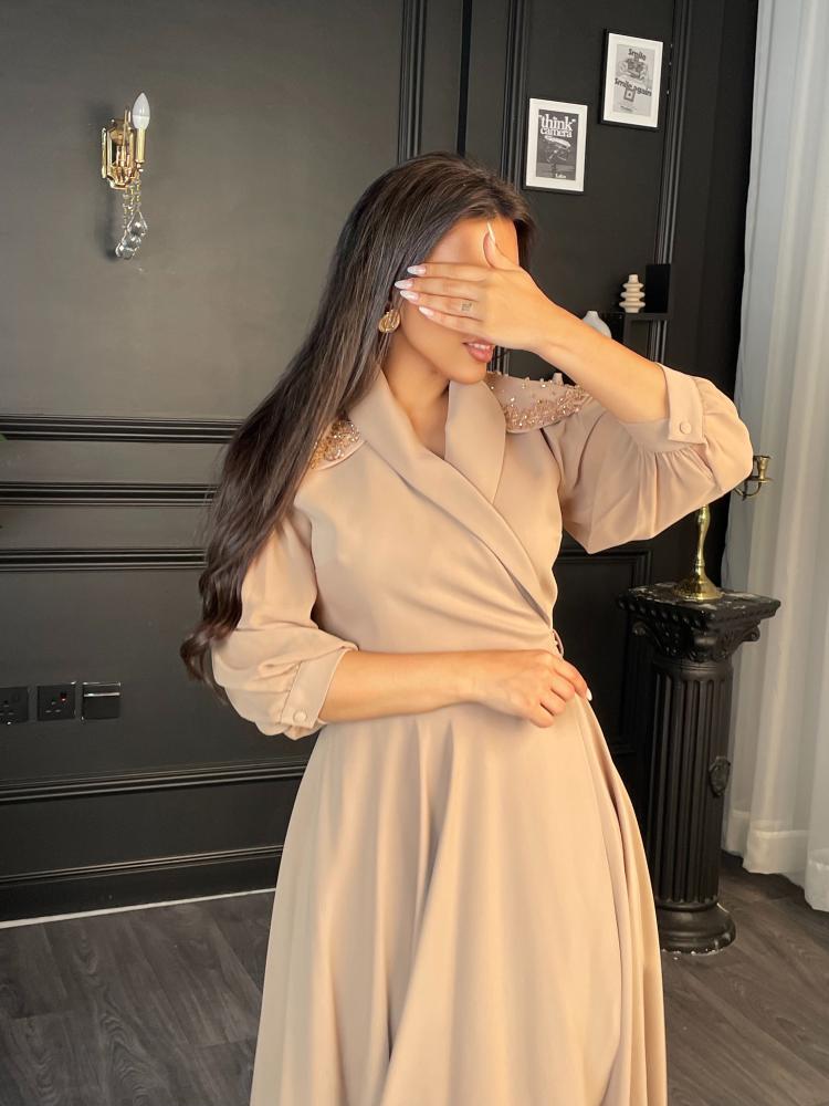 وصف المنتج : • فستان فخم لف باللون البيج . • يحتوي على كتافات مطرزه من الأكمام . • فستان فخم صناعة تركية .
